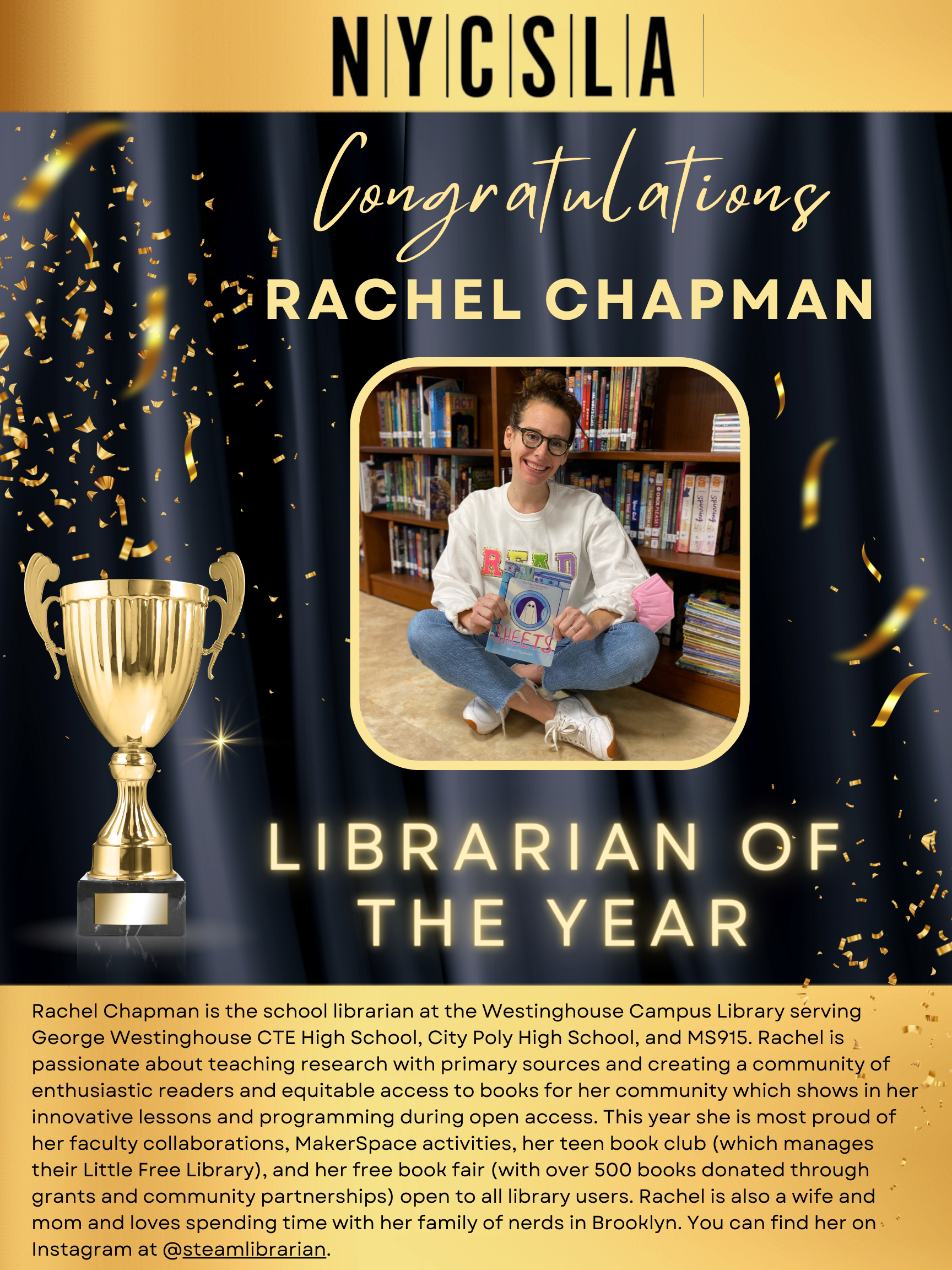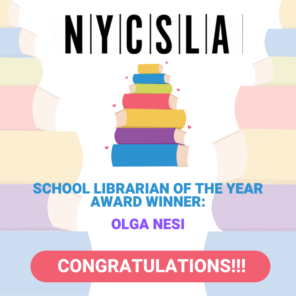 The New York City School Librarians’ Association (NYCSLA) annually recognizes an exceptional K-12 school librarian with the School Librarian of the Year Award. This honor is bestowed upon a NYCSLA member who develops dynamic and innovative programs, fosters student engagement and achievement through instructional collaborations, and serves their school community with distinction. The award celebrates the vital role school librarians play in supporting student learning and advancing the goals of New York City public schools.