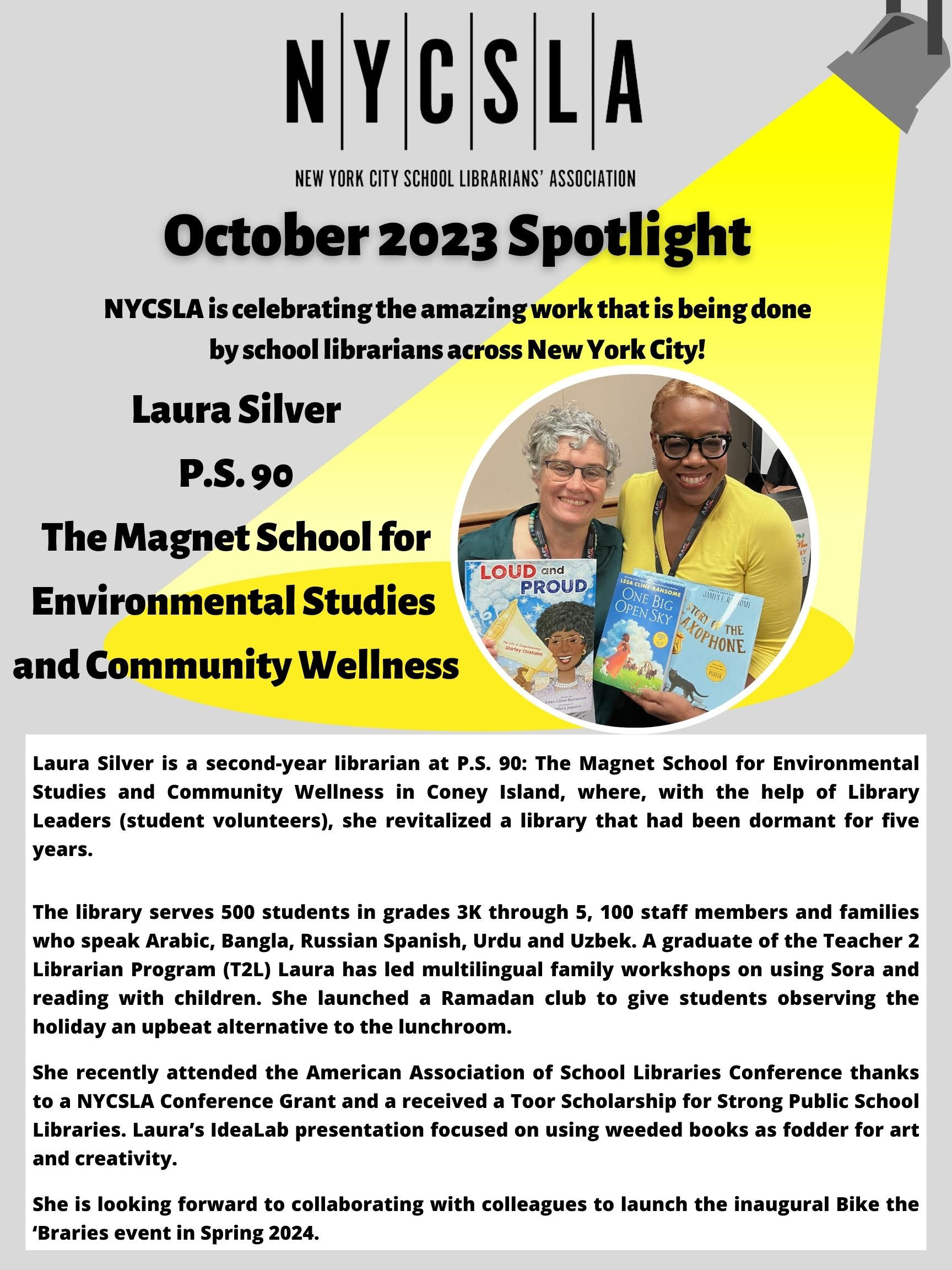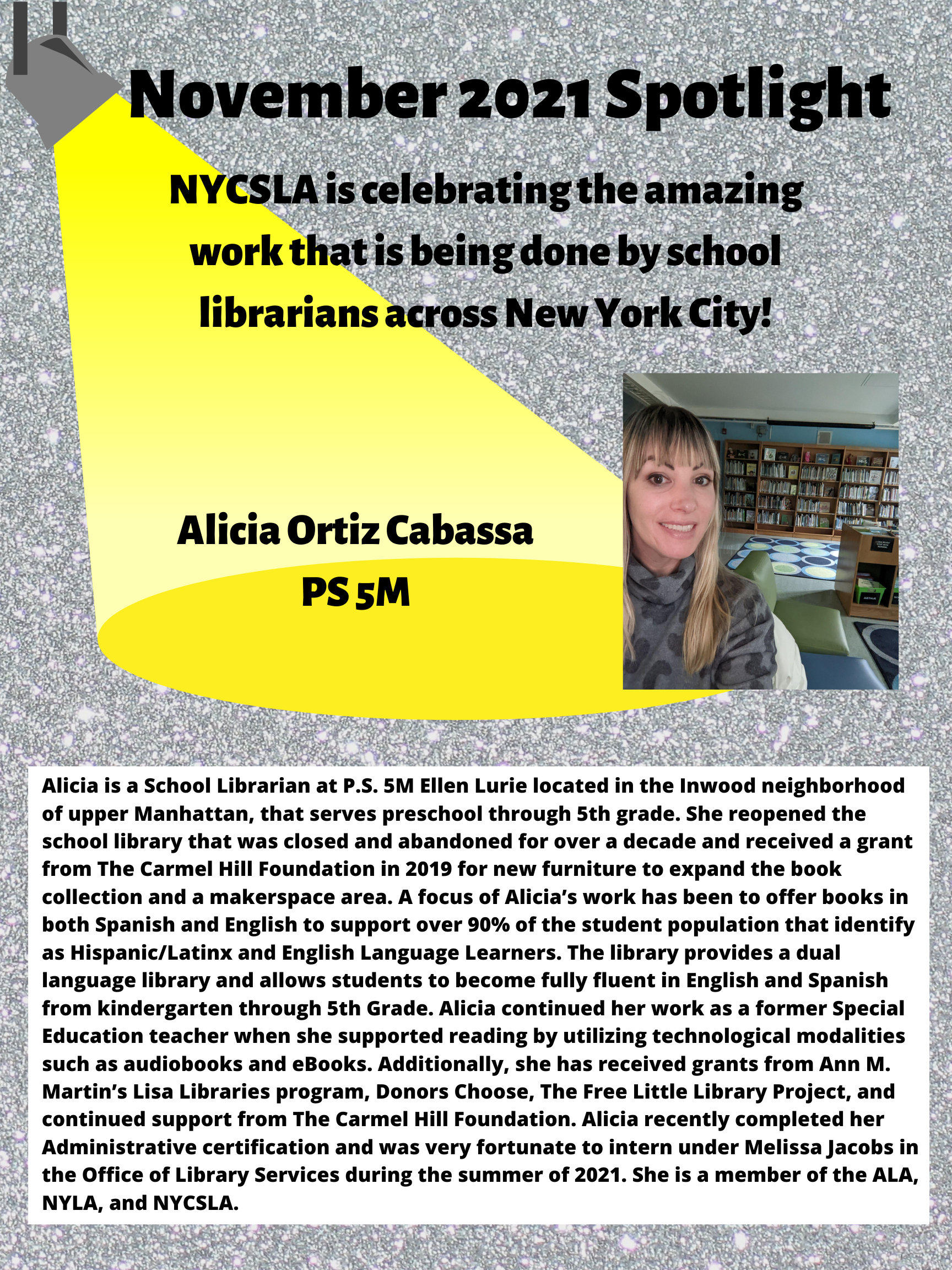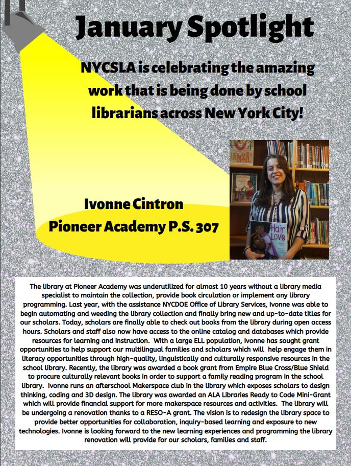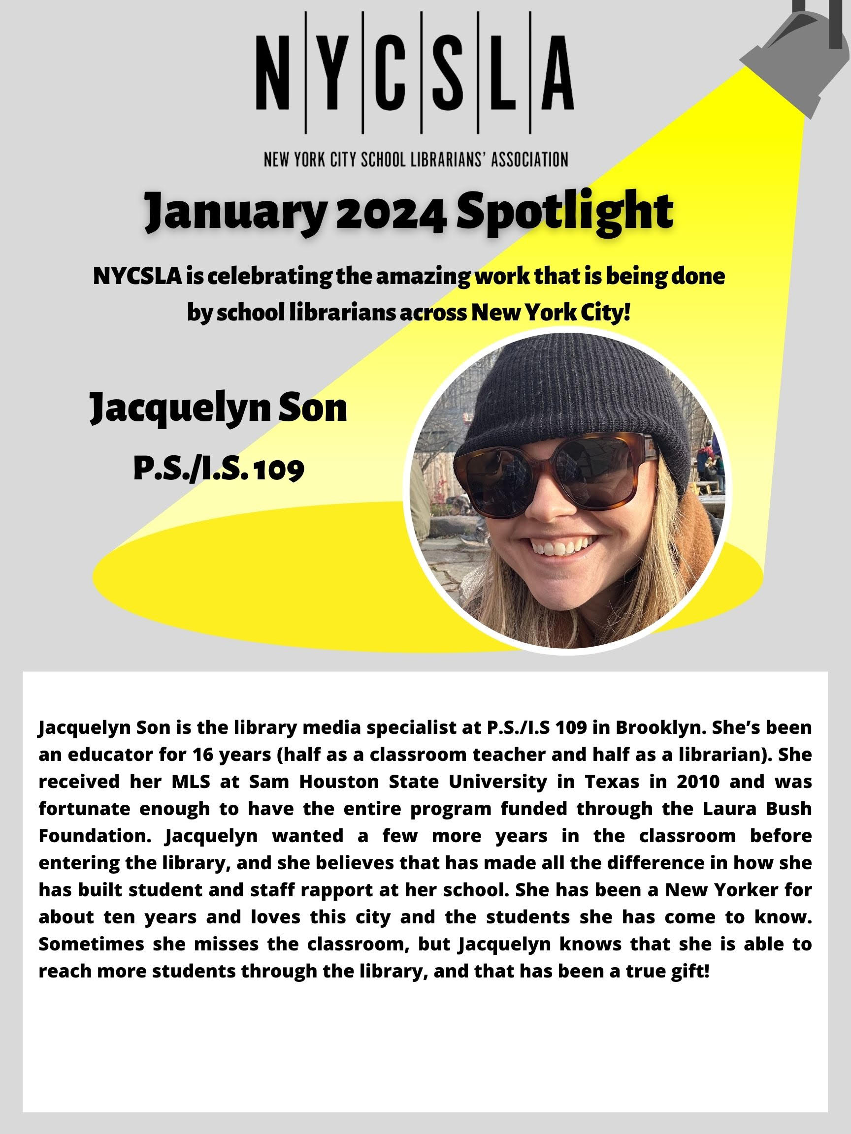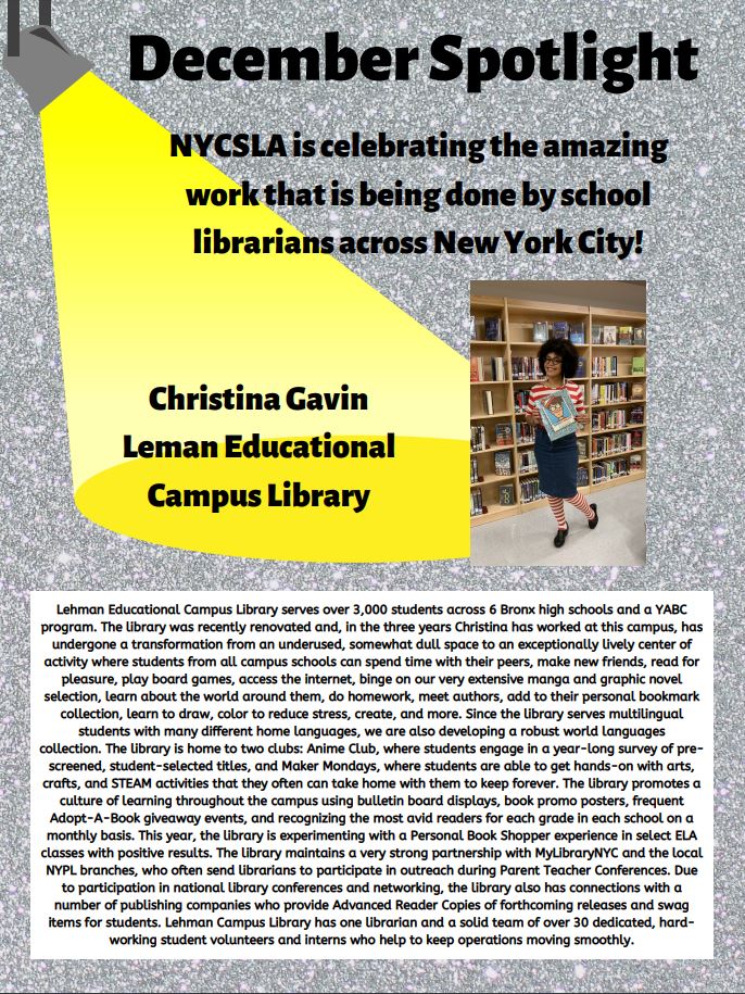 NYCSLA honors a Spotlight Librarian every month during the school year to recognize those who have had profound impact on their communities. This initiative aims to highlight the dedication, expertise, and profound impact of school librarians by showcasing their outstanding contributions. NYCSLA celebrates their efforts in promoting literacy, fostering a love for reading, and empowering students with essential research and information literacy skills. The Spotlight Librarian program serves as a platform to share inspiring stories and best practices, while acknowledging the vital role school librarians play in shaping the educational experiences of students across New York City.