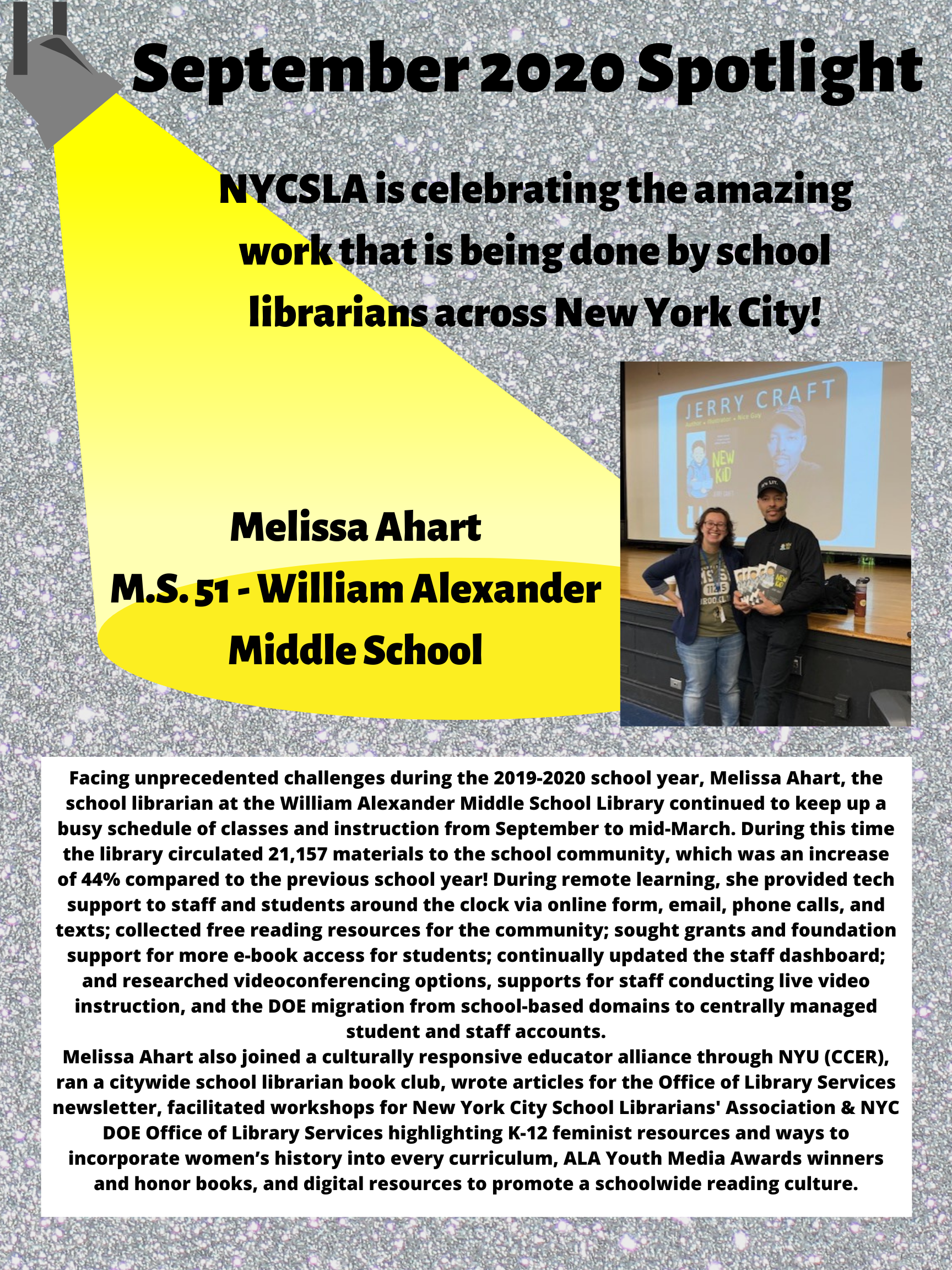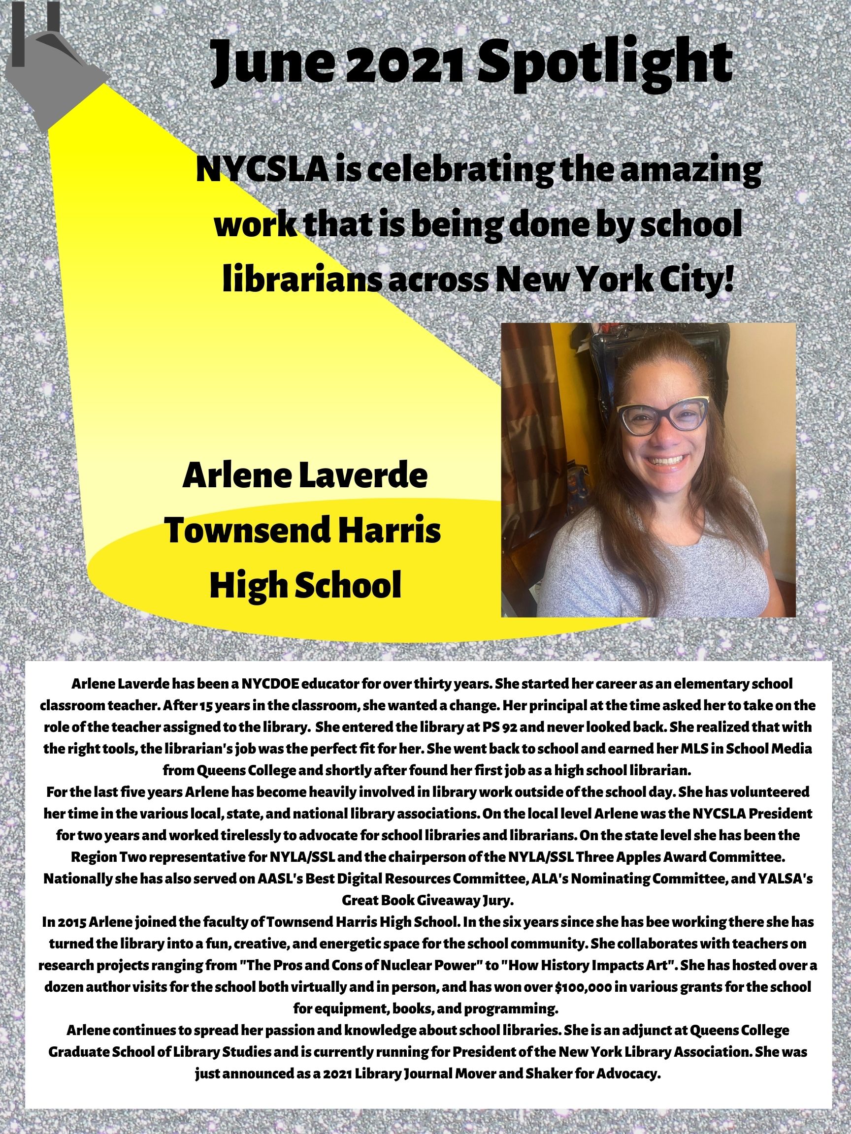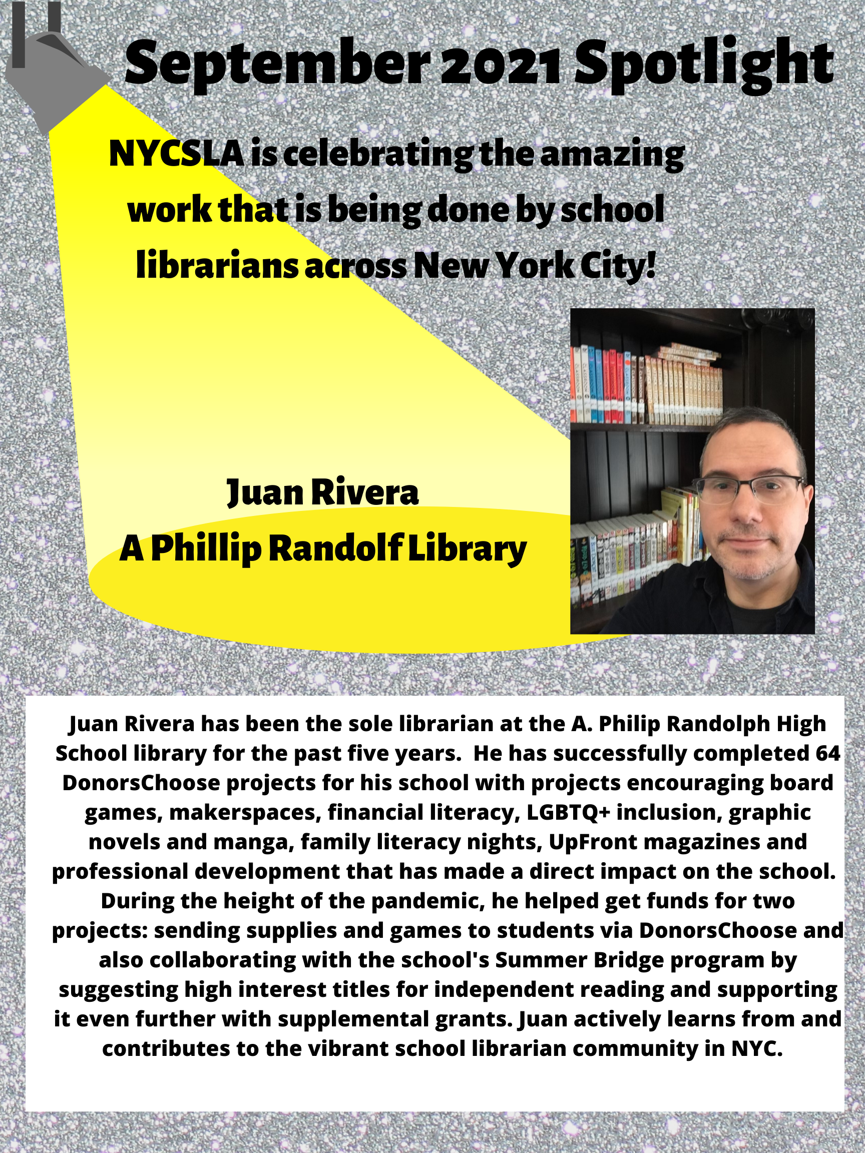 NYCSLA honors a Spotlight Librarian every month during the school year to recognize those who have had profound impact on their communities. This initiative aims to highlight the dedication, expertise, and profound impact of school librarians by showcasing their outstanding contributions. NYCSLA celebrates their efforts in promoting literacy, fostering a love for reading, and empowering students with essential research and information literacy skills. The Spotlight Librarian program serves as a platform to share inspiring stories and best practices, while acknowledging the vital role school librarians play in shaping the educational experiences of students across New York City.