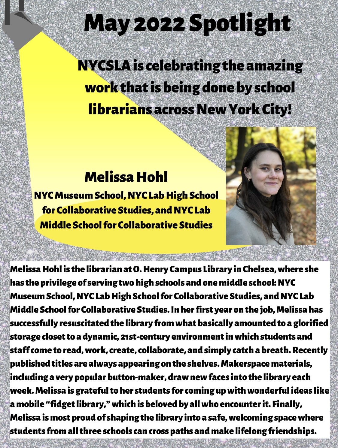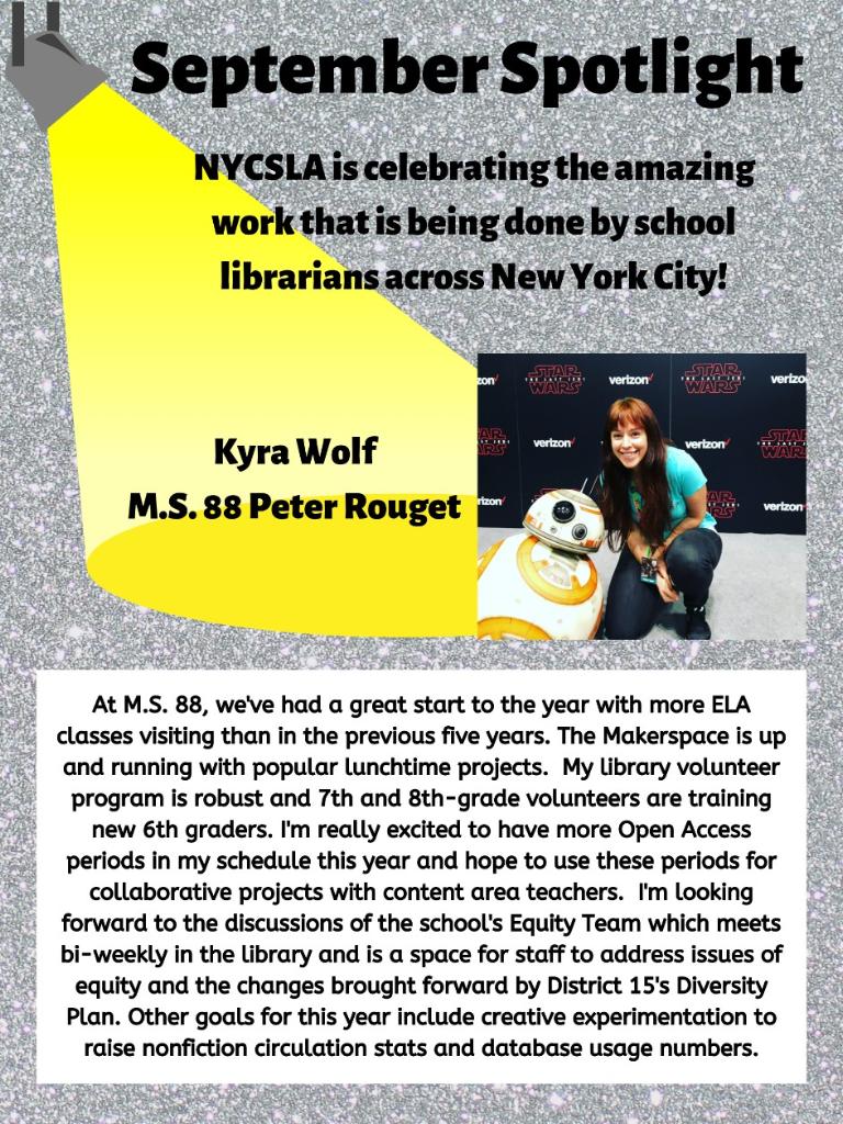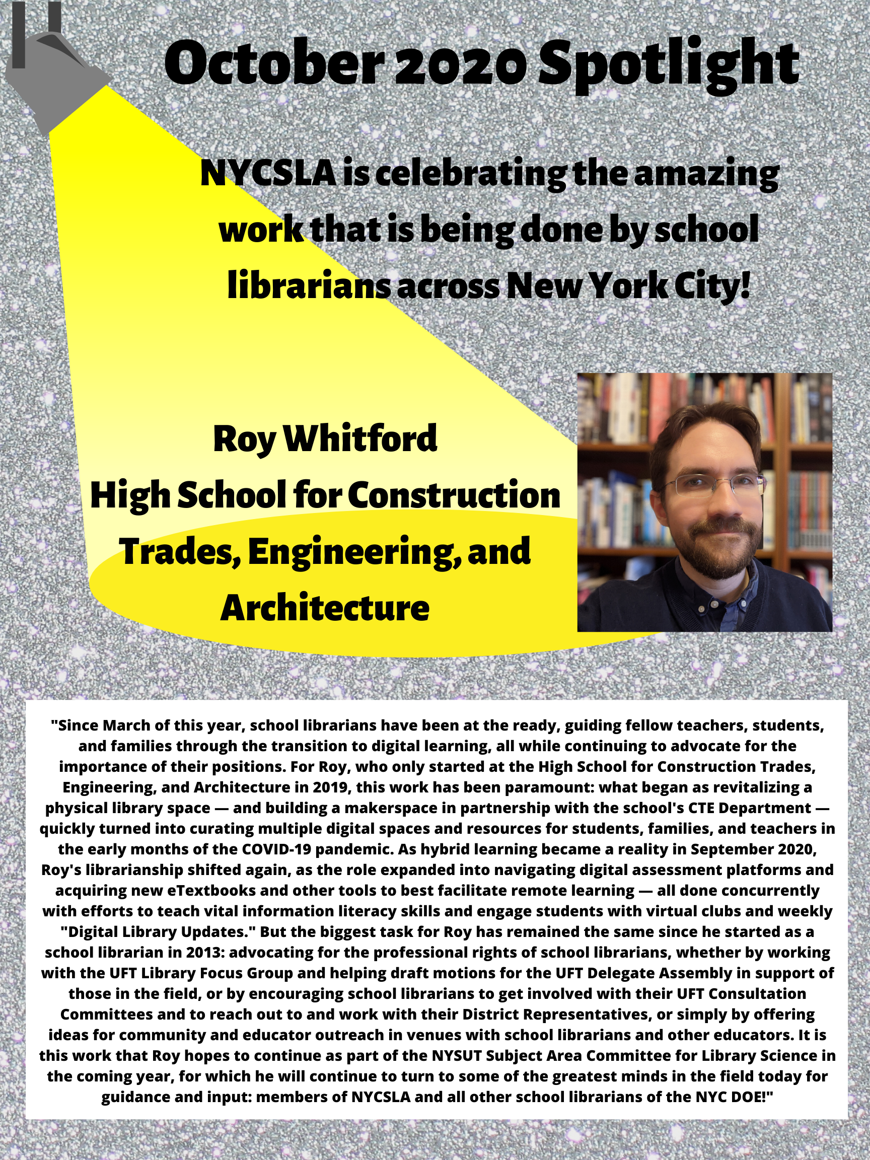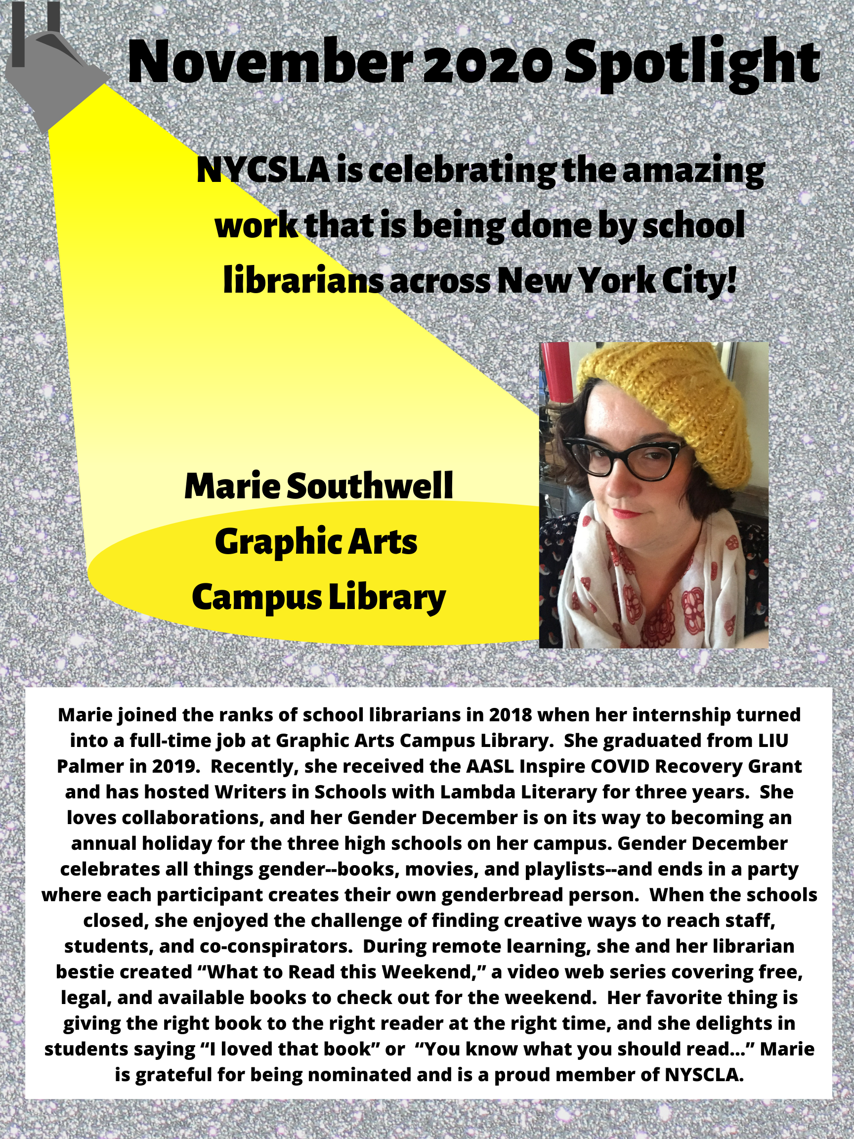 NYCSLA honors a Spotlight Librarian every month during the school year to recognize those who have had profound impact on their communities. This initiative aims to highlight the dedication, expertise, and profound impact of school librarians by showcasing their outstanding contributions. NYCSLA celebrates their efforts in promoting literacy, fostering a love for reading, and empowering students with essential research and information literacy skills. The Spotlight Librarian program serves as a platform to share inspiring stories and best practices, while acknowledging the vital role school librarians play in shaping the educational experiences of students across New York City.